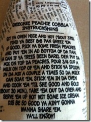 I felt like making a treat after dinner tonight. At first, I really wanted to make brownies, but alas, I was out of brownie mix. I could have made them from scratch, I know, but I didn’t really want to take a long time to make my treat, since I was doing other things, so finally, I decided on a peach cobbler, made from a mix PJ brought me from Louisiana. This is what the bag looks like: